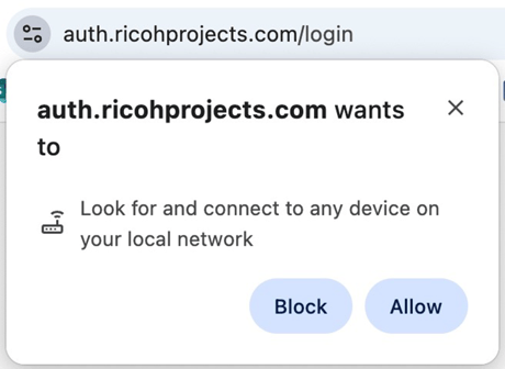 - If you have a specific network security tool in place (commonly referred to as SASE), when you access a web app using Chrome 142 or later, you will see a dialog that says "auth.ricohprojects.com is asking for permission".